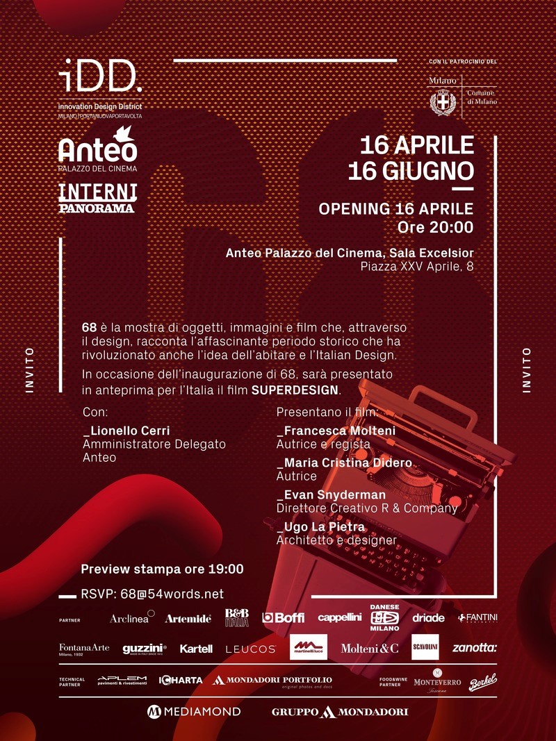 - con Interni Panorama, iDD celebra il 68: un anno denso di avvenimenti e di svolte, che trovano riscontro anche nel design di quel periodo. Ecco allora una mostra, allestita all’interno di Anteo Palazzo del Cinema. Qui sono raccolti gli oggetti che proprio in quegli anni venivano messi in produzione, testimoni dell’ansia di cambiamento e di rottura degli schemi di quel periodo.