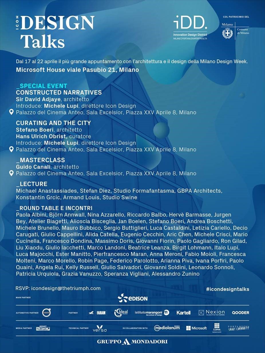 - Icon Design ha invece raccolto per i suoi Talks un numero impressionante di architetti e designers. Guidati da un tema comune, Common Future, i talks di Icon Design si terranno nel cuore dell’Innovation Design District milanese, e precisamente alla Microsoft House, mentre sarà Anteo Palazzo del Cinema ad ospitare le masterclass con i nomi di punta del settore.