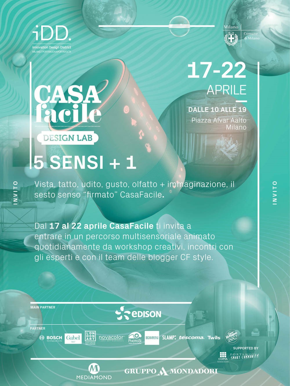 - la redazione di Casa facile accoglierà i lettori all’interno del suo Design Lab in piazza Alvar Aalto. E’ qui che si avvicenderanno i workshop e gli incontri tematici in programma. Il brand ha quest’anno intitolato ai 5 sensi + 1 gli eventi in programma. Il design lab di Casa facile sarà infatti un percorso multisensoriale per scoprire come il digitale e la tecnologia possono aiutare a creare spazi abitativi ispirati alla natura e all’immaginazione.