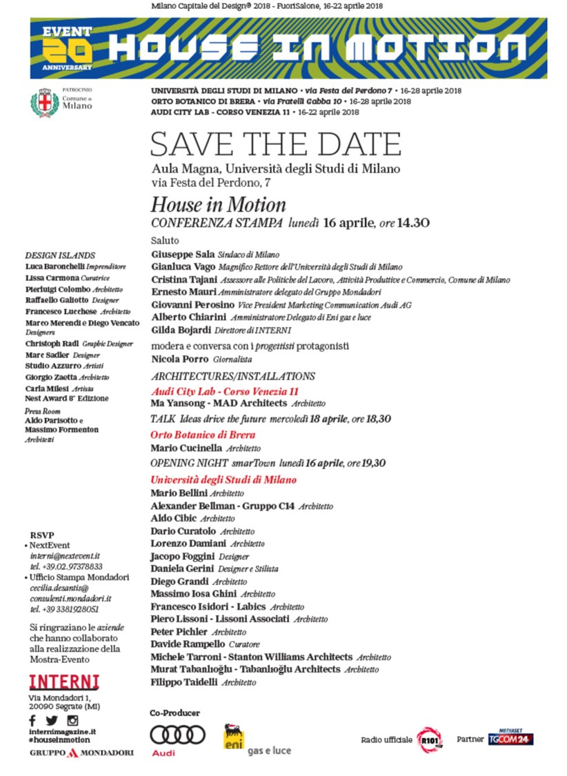 - anche per Interni il programma è ricco di appuntamenti: oltre alle sempre attese installazioni nei cortili di Università Statale, Interni propone eventi e performance presso l’Orto Botanico e nell’ex Seminario Arcivescovile in corso di Porta Venezia. House in Motion, tema scelto dal brand per il Salone 2018, allude al nuovo spirito che anima la progettazione oggi, che punta a uno stile di abitare in grado di andare di pari passo con il cambiamento di chi abita, modificandosi e adattandosi continuamente.