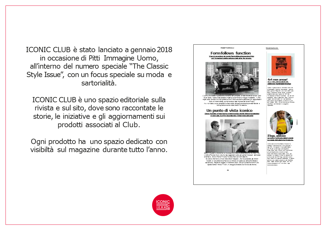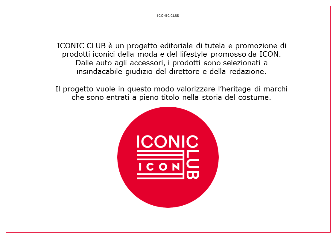 Questa è la filosofia di Iconic Club, che ha debuttato quest’anno tra le pagine di Icon con uno spazio editoriale speciale dedicato proprio alle storie di queste icone: dall’intramontabile mito della Vespa Piaggio o il Defender di Land Rover per i motori, passando per capi d’abbigliamento rimasti impressi nella memoria storica dello stile universale come il Fay 4 Ganci o i Levi’s 501, il Baracuta G9 Harrington Jacket o il Valstarino di Valstar, fino ai mitici occhiali Persol 714 o la Montblanc Meisterstück. Dietro ognuno di questi simboli c’è molto più che un semplice prodotto, ma il racconto di una storia originale, capace di crescere nel tempo e fino a creare uno status symbol in fatto di stile.