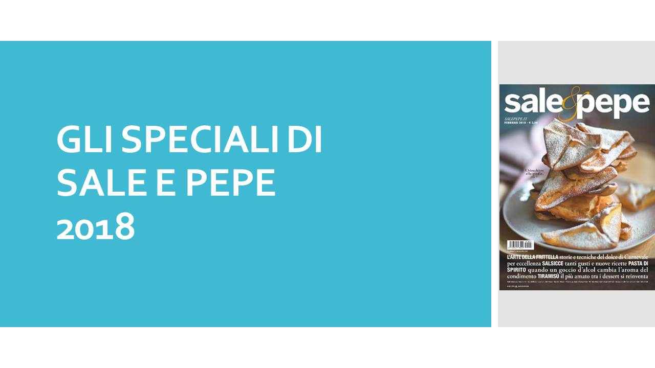 Sale e Pepe è il mensile di cucina elegante e d’immagine di Mondadori. La rivista reinterpreta la tradizione gastronomica italiana in linea con i nuovi comportamenti alimentari. Immagini curate e ricette ricercate sono i caratteri distintivi del magazine, che ritroviamo anche nel sito www.salepepe.it