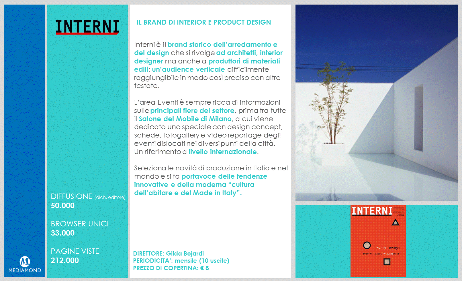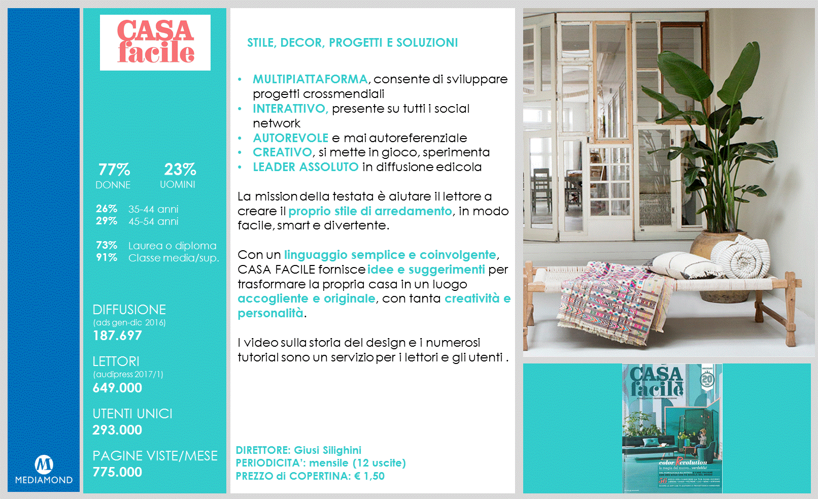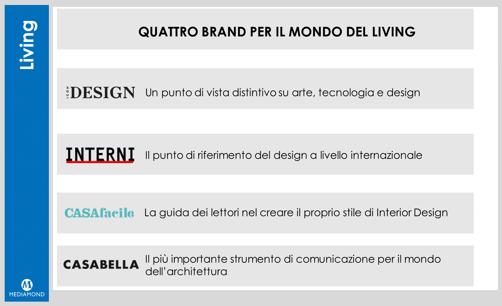 Casa facile è all’interno del sistema Mediamond Living, composto da quattro testate giornalistiche multicanale: oltre a Casa facile troviamo Icon Design, Casabella e Interni, brand che rispondono alle diverse esigenze del pubblico e delle aziende. Potete “ripassarli” insieme insieme a noi con questa breve presentazione.